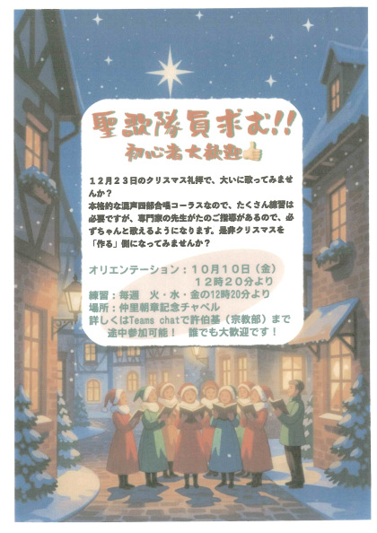 宗教部では、12月23日(火)に行なわれるクリスマス礼拝での聖歌隊を募集しています。