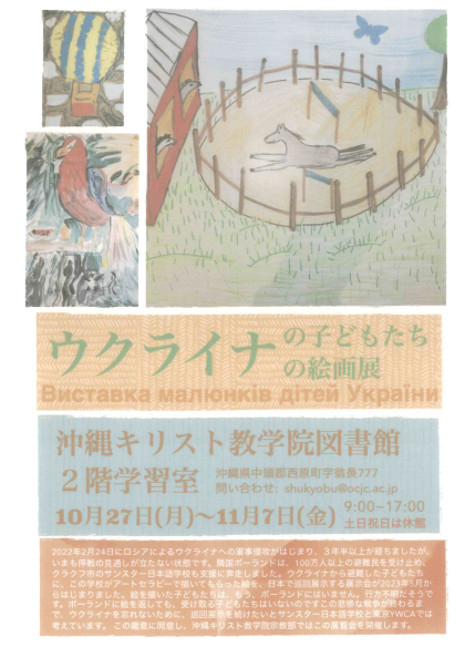 絵を描いてもらった子どもたちはもう、ポーランドにはいません。行方不明だそうです。ポーランドへ絵を返しても受け取る子どもたちはいないのです。この悲惨な戦争が終わるまで ─ ─ ウクライナを忘れないために巡回展示を続けたいとサンスター日本語学校と東京YWCAでは考えています。この趣意に同意し、沖縄キリスト教学院宗教部ではこの展覧会を開催いたします。