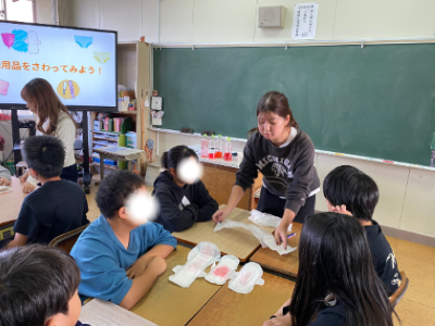 「生理ナプキンに触れてみよう」では、実際に昼用、夜用、ノンポリマーなど種類の異なるナプキンに赤い液体を垂らして、吸収の違いなどを体験しました。初めてナプキンに触れる児童もいて、その吸収力に驚きながらも、「生理とは、赤ちゃんを産むために大切なことで、健康の証でもある。恥ずかしがらずに話せるようになろう」というメンバーの言葉を素直に受け止めていました。