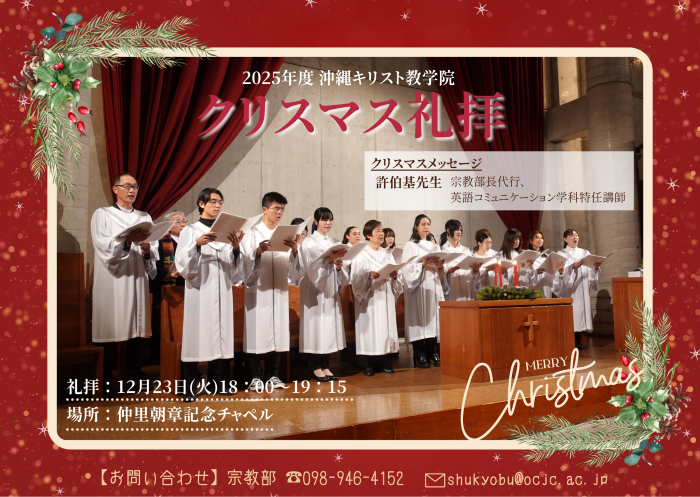 日程:2025年12月23日(火) 18:00~19:15(開場17:30~) 場所:仲里朝章記念チャペル