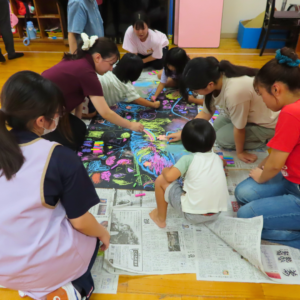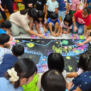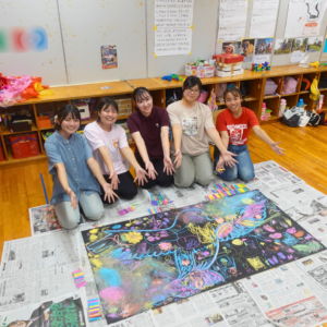 今回は本学学生と坂田保育所の児童たちが一緒に制作した共作となります。学生たちが描いた絵に、園児たちが思い思いのデザインを重ね、最後に学生たちがそれを仕上げる形で完成した特別な1枚となりました。