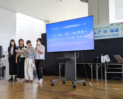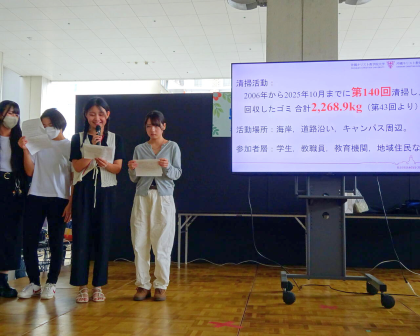 2025 エコカレッジ支援事業参加報告 私たちWLOサークルは,2025年11月2日(土),沖縄県主催の「エコカレッジ支援事業」に参加し,清掃活動のプレゼンテーション報告を行いました。テーマは「わした美ら島を未来へ - WLOがつなぐ小さな行動,大きな変化 -」です。メンバー4名が登壇し,これまでの活動実績と今後の展望について報告しました。 WLOサークル(We Love Okinawa)は,「沖縄を愛し,地域とともに美ら島の自然環境を守る」ことを目的に,2006年に本学で誕生した学生団体です。これまでに140回の清掃活動を実施し,累計で2,268.9kgのごみを回収しました。活動は海岸,道路沿い,大学周辺などで行われ,学生のみならず教職員や地域住民,教育機関など幅広い世代が参加しています。清掃を通して地域とのつながりが深まり,人と人との出会いが生まれる場にもなっています。 発表では,「拾っているのはゴミではなく,私たちの豊かな未来です。」というサークルの合言葉を紹介しながら,活動の中で生まれた小さな気づきや地域との交流エピソードを共有しました。ある子どもが「ゴミを拾うと空気まできれいになった気がするね」と話してくれた出来事や,参加者から寄せられた温かい言葉は,環境教育の意義を実感させるものでした。 また,WLOの活動が「おきなわアジェンダ21」の理念と合致し,学生主体のエコ教育・地域連携の実践例として位置づけられることを示しました。今後は清掃活動に加え,子どもや地域の方と協働する出前授業などへ活動を広げていく構想も発表しました。聴講者からは「学生の視点で環境を語る姿に感動した」「地域と教育を結ぶ新しい形」といった反響をいただきました。 今回の発表を通して,私たちは環境活動が「学びの場」であり「つながりの場」であることを再確認しました。今後も“きれいな沖縄だけでなく,誇れる沖縄を残したい”という想いを胸に,小さな行動を積み重ねていきます。