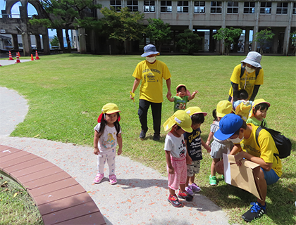 本日、本学お隣の坂田保育所2歳児クラスの子ども達が、本学中庭までお散歩に来ました。