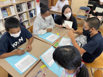 卒業研究のシニアプロジェクトの一環で実現した今回の出前授業では、大学生がサポートしながら、うちなーぐちのクイズやゲーム(お買い物ゲーム等)を通して、小学生にも分かりやすい内容で展開しました。うちなーぐちの単語や会話に加え、うちなーぐちの現状や歴史的背景も学び、どうしたら継承できるか等も話し合いました。