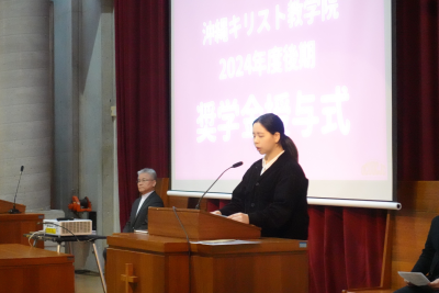 沖縄キリスト教学院後援会奨学生をはじめ、31名の学生に奨学金が授与されました。 奨学生を代表して、英語コミュニケーション学科 4年次の渡慶次みみさんが感謝の言葉を述べ、金学長や来賓の方からの励ましの言葉もあり、奨学生は緊張の中にも自覚を持って学生生活に臨む決意が伺えました。