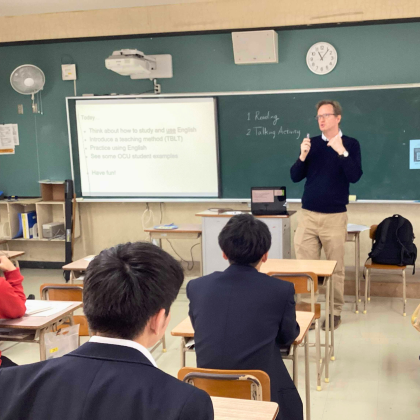 2月2日(月)、中部商業高校の3年生を対象に英語コミュニケーション学科のChristopher Valvona教授が「英コミュ力を伸ばそう~英語を使って学ぶ~」、2月24日(火)には1年生を対象に地域こども保育学科の大城りえ教授が「今日から使える心理学」の出前講座を行いました。